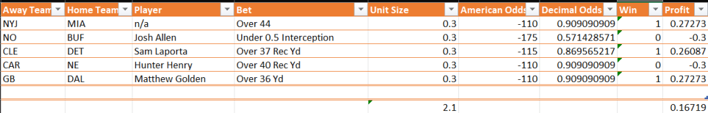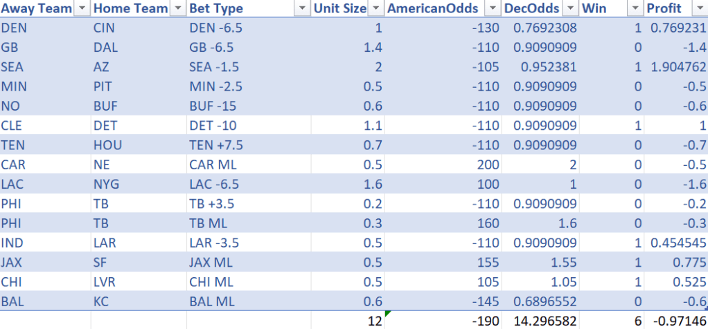 Another not so great week! Last year the picks themselves and the profit were both well above 0.500, but so far it has not fared as well this year! Last week could at least be blamed on some absolutely unlucky last minute plays but the model had no excuses this week given half of these games were over before half, although it did have some nice upset picks (Bears, Jags). Even though I didn’t post the Vikings game picks, im keeping that in out of fairness. Heres to a much better week next week!